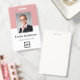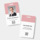 Personalize facilmente este crachá personalizado de nome e foto do funcionário cor-de-rosa com o logotipo da sua empresa e código qr ou código de barras. Disponível com diferentes cores de fundo e acessórios. Sem quantidade mínima de pedido.