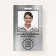 Crachá de nomes de funcionários profissionais modernos com sua foto, nome e posição, e o logotipo de sua empresa ou organização contra um fundo metálico falso prateado. No verso, adicione qualquer informação adicional e códigos de QR e bar opcionais.