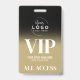Evento para o seu logotipo Preto, Dourado, todo o Crachá VIP de acesso. Excelente para desfiles, concertos, grandes eventos especiais, como conferências, auto-falantes, e pode até trabalhar para uma festa de aniversário ou qualquer outra parte onde você queira fazer seus convidados se sentirem especiais. Um simples, moderno, mas elegante, olha com um local para adicionar sua empresa ou até mesmo logotipo no topo (ou substitua por um ícone divertido se fizer um evento de aniversário). Na parte inferior está uma fonte serif em negrito misturada com uma simples tipografia, com VIP, o nome do evento, a data e 'Todos os acessos passados'. Você pode alterar todas as informações de texto e cores deste crachá (exceto o gradiente preto superior.