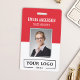 Personalize facilmente este crachá de nome e foto do funcionário personalizado vermelho com o logotipo da sua empresa e código qr ou código de barras. Disponível com diferentes cores de fundo e acessórios. Sem quantidade mínima de pedido.