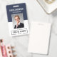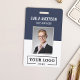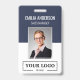 Personalize facilmente este crachá de nome e foto do funcionário personalizado azul com o logotipo da sua empresa e código qr ou código de barras. Disponível com diferentes cores de fundo e acessórios. Sem quantidade mínima de pedido.