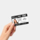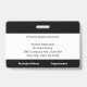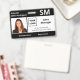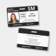 Crachás personalizados horizontais com foto e identificação apresentam a foto do seu funcionário, nome, abreviação do cargo profissional e título do cargo, número de identificação, logotipo e nome da empresa. Você também pode incluir um departamento, se desejar. Perfeito para qualquer profissão. No verso, você pode adicionar mais informações, como para onde devolver o crachá se ele se perder. Personalize-o com uma foto, logotipo de qualquer forma e texto personalizado na barra lateral. A foto quadrada à esquerda tem uma borda branca fina cercada por faixas pretas na parte superior e inferior e linhas pretas finas ao lado. Um bloco branco no centro do lado direito destaca o logotipo, título do cargo, número de identificação e data de validade em texto preto. O nome da pessoa da equipe, iniciais do cargo e texto do hospital ou empresa são brancos sobre preto.