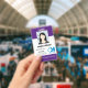 Crie seus próprios crachás e etiquetas de identificação personalizados para funcionários usando um modelo moderno vertical fácil de adicionar sua própria foto, logotipo da empresa, código de barras e outras informações importantes. Um design empresarial simples em roxo e branco & nome e título com código de barras. Sem pedido mínimo.