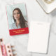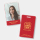 Crachá moderno, simples e profissional de funcionários empresariais em fundo vermelho com tipografia dourada para corresponder ao seu logotipo personalizado, a foto do funcionário e o título ou departamento profissional na frente e no logotipo comercial e informações adicionais na parte traseira.
