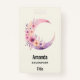 Nome de etiqueta com uma bela ilustração com uma lua rosa e púrpura da lua. Bonito flores silvestres cor-de-rosa e amarelas adornam este corpo celeste.