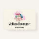 Um nome de etiqueta com uma imagem encantadora. 3 macarões coloridos, cor-de-rosa, verdes e azuis, com um buquê floral rosa rico e um salto de cor-de-água rosa. Delicioso e na moda também! Fundo amarelo claro.