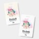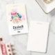Crachá personalizado com uma imagem encantadora. 3 macarons coloridos, rosa, verde e azul com um buquê floral de rosa sofisticada e um toque de aquarela rosa ao fundo. Delicioso e elegante também! Fundo amarelo claro.