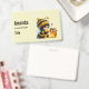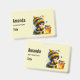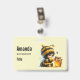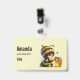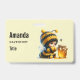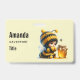 Nome de etiqueta com uma bela imagem. Uma garota com uma fantasia de abelha em crochê com uma abelha ao lado dela. Vendo um pote de mel.