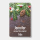 Um nome de etiqueta com uma fotografia rústica de uma mesa marrom de madeira com pinecones, agulhas de pinheiros, neve e Enfeites de natal. Festivo e adorável.