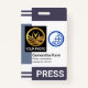 O cobrir apresenta um par de colunas de faixa de cinza nas camadas superior e inferior do crachá. Na parede esquerda do crachá está uma placa especial de cinza de luz que contém um modelo de foto. Aqui você pode colocar fotos que tenham um tamanho de 1.000 x 1.200 pix. Essa coluna ajudará com fotos que têm um fundo branco. Ao lado da foto está um logotipo opcional do globo azul que você pode usar. O logotipo é baseado no conceito de design "mundo quebrado". A isto segue-se o seu nome prestigiado, o cargo e o número do funcionário abaixo. Uma legenda "PRESS" pode ser encontrada perto da base do crachá, altere-a para atender às suas necessidades de serviço.