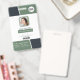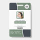 Professional identification card with photo, logo, barcode, and qr code templates included. This modern design style has shades of muted green and black with white base. Similar design on back, with business address, website address, and a website qr code.