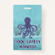 Forneça segurança e ajude a evitar afogamentos na sua piscina. O monitor de segurança da piscina veste este crachá e se concentrará em ver todos nadando na piscina. A parte traseira da carta mostra sinais de afogamento e como resgatar uma pessoa afogada. Seja responsável e seguro nas suas piscinas ou na sua família e amigos na natação do quintal natação. Possui um polvo amigável e texto tipográfico que lê Monitor de Segurança de Piscina.