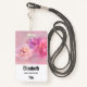 Crachá personalizado com uma fotografia com um buquê de cravos cor-de-rosa. Preparado num fundo etéreo sonhador.