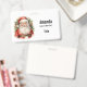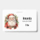 Nome de etiqueta com uma imagem de aquarela de estilo de vintage fofo. Papai Noel de terno vermelho com bochechas alegres e um rosto sorridente. Cercado por pinheiro e sagrado.