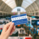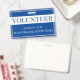 Este crachá de identificação para um voluntário apresenta um fundo azul sólido. O título "Voluntário" é impresso sobre um banner branco em texto azul para que o título seja facilmente visível. Você pode personalizar o crachá de identificação para incluir o nome da sua empresa ou organização ou outro texto personalizado.