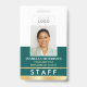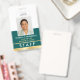 Crie uma aparência profissional com este crachá personalizado de identificação de funcionarios. Um modelo simples e na moda com sua foto de ID, nome, cargo, número do funcionário, logotipo da empresa e código de QR digitalizável. Todo o texto pode ser personalizado ou excluído para atender às necessidades de sua empresa. Este design elegante serviria a muitos locais de trabalho e profissões diferentes, incluindo vendedores a retalho, funcionários de restaurantes e alimentos, funcionarios de escritório, pequenas empresas, nomes de etiqueta de conferências e muito mais! Cores impressas: verde e branco com gradiente dourado.