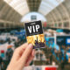 A crachá de identificação do passe de acesso total para VIPs pode ser personalizado com o nome do seu evento, data e informações do local. A foto da multidão do show pode ser usada ou substituída por uma foto sua. O código QR no verso pode ser personalizado para direcionar ao seu site.