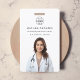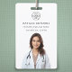 Um crachá mínimo de na moda de identificação de funcionário com tipografia clássica em um fundo branco minimalista e limpo. O texto, o logotipo e o código QR podem ser facilmente personalizados para que um toque profissional corresponda à sua marca clínica e se misture bem em um ambiente médico profissional. Um design simples, minimalista e contemporâneo para um ambiente hospitalar, clínico ou médico.