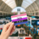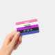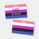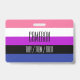 O fundo é a bandeira de orgulho para pessoas genderfluid. Este é um padrão listrado de rosa, branco, roxo, preto e azul. Há espaço para um nome personalizado e pronomes.