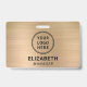 Crachá do nome moderno com o logotipo da sua empresa ou organização contra um fundo metálico de buracos em ouro. Adicione um nome e um título em tipografia simples.