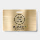 Placa de identificação metálica dourada moderna e falsa com o logotipo da sua empresa ou organização. Adicione um nome e cargo em tipografia simples.
