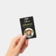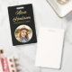 Apresenta texto dourado para o seu nome e profissão com fotografia pessoal com borda dourada em fundo preto em ambos os lados.
