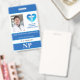 Crachá vertical de identificação médica (ou outro, pois é possível alterar as iniciais e a descrição usando as caixas de texto fornecidas). Design em azul e branco com detalhes em aqua. Iniciais NP em texto branco sobre a seção azul inferior. Área para foto ID com capacidade para adicionar imagens em retrato ou paisagem. Coração azul e aqua com logotipo médico heráldico, que pode ser mantido como está ou alterado para adicionar o logotipo da sua empresa, facilmente trocando a imagem no modelo. Área para nome completo, cargo, nome do hospital ou empresa e número de identificação (se o número de identificação não for necessário, é possível apagar os caracteres da caixa de texto para remover ou adicionar qualquer outra informação desejada). Seção para nome da empresa/hospital. Verso em azul com informações para o caso de extravio do crachá. Mesmo crachá com código ID também disponível. Para toda a equipe médica nas linhas, OBRIGADO POR SEU SERV