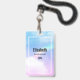 Crachá de nome personalizado com uma imagem de fundo suave e adorável. Céus azuis pastéis e nuvens cor-de-rosa com um arco-íris mágico.
