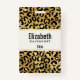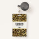 Crachá de nome personalizado com um padrão na moda. Manchas negras negras exóticas num fundo de ouro. Um estilo selvagem mas elegante. Quadro de retângulo amarelo antigo com bordas falsas de folha de ouro colocadas sobre cima com o dentro de texto personalizado.