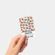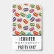 Nome crachá com um padrão fofo de macarões em muitas cores diferentes com um padrão de bolinhas fraco atrás.