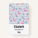 Crachá personalizado com um padrão com uma vibração de verão divertida. flamingos e abacaxis cor-de-rosa, colocados sobre um padrão listrado azul claro com folhas e corações ao redor.