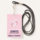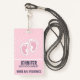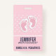 Crachá de nomes com uma imagem adorável de pegadas cor-de-rosa de menina com um contorno branco pesado. Bolinhas brancas sobre um fundo rosa atrás da ilustração. Perfeito para enfermagem, cuidados infantis, pediatria, etc.