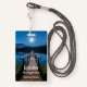 Um nome de etiqueta com uma bela fotografia de um píer de madeira esticado sobre um lago calmo. O céu noturno coberto de estrelas e uma bela lua de cheio.