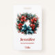 Nome crachá com uma bonito coroa de Natal. Uma imagem festiva com um pínus corado com flores vermelhas, holly e um adorável arco azul. Que encantador.