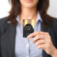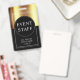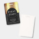 Modelo de Crachá de Evento preto e dourado metálico. Substitua pelo nome e data do seu evento. Estilo glamoroso e luxuoso. Esta versão vem com um cordão, mas você pode escolher o estilo de fixação que inclui cordão, clipe de metal ou retrátil.