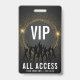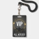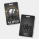 Crachás VIP modernos. Design apresenta fundo preto e ouro com ícone de concertadores, script VIP em letras brancas e informações adicionais. Perfeito para concertos e grandes eventos. Adicione informações adicionais sobre eventos à parte traseira do crachá em letras brancas em preto.
