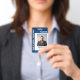 Crachá de identificação vertical do professor personalizado com foto, nome, ID nr, departamento e o ano em que o crachá é válido em um design azul com uma xadrez azul. padrão como um pequeno detalhe.