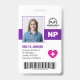 Crie um crachá de identificação elegante e profissional para Enfermeiro Especialista. Este modelo personalizável apresenta um design moderno e limpo com espaço para uma foto, nome, ID do funcionário, localização, título (NP), data de validade e um código de barras para maior segurança. Personalize facilmente com o logotipo do seu hospital ou clínica, tornando-o uma solução de identificação perfeita para profissionais de saúde. Este modelo é ideal para hospitais, clínicas, casas de repouso e outras instalações de saúde. A paleta de cores roxas profissionais cria uma estética limpa e confiável.