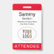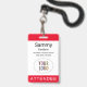 Personalize nosso crachá profissional de participante com o logotipo do seu evento, nome do participante e outros textos personalizados. É feito de plástico PVC e disponível com cordão, clipe ou carretel retrátil. Design moderno e minimalista criado pela MISOOK, nas cores vermelho e outras. Todas as cores são personalizáveis. Você pode adicionar conteúdo opcional no verso (código QR, termos, etc). Personalize facilmente o título do participante (convidado VIP, visitante, palestrante, etc). Sem quantidade mínima de pedido e sem taxa de configuração.