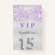Um crachá moderno, na moda e glamouroso para a Quinceañera, festa de aniversário de uma menina. Um fundo com aspecto de prata falsa, com brilho falsa de cor lavanda. O nome é escrito com um moderno estilo escrito à mão. Com o texto: VIP Número 15 é escrito com uma fonte de estilo de balão, script. Voltar: data da festa e endereço do local.
