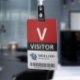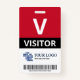 Crachá de visitante vertical com um V grande contra um fundo branco. Visitante em letras limpas. Adicione seu logotipo e código de bar. Crachá de visitante personalizado com logotipo e código de barras em um design minimalista em vermelho, branco e preto.