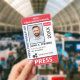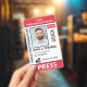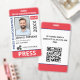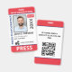Medium sized 3"x5" vertical press ID with red and blue as accent colors. Add photo, your news publication logo, the reporter's name, title, the badge ID number and more. This Press ID is in a slightly larger size for easy visibility. Add your QR code to the back as well.