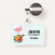 Crachá de nomes com uma ilustração digital fofinha apresentando um flamingo cor-de-rosa com uma perna levantada. Em pé sobre um buquê de flores e folhas de hibisco tropicais. Uma borboleta bonito está pairando ao redor das flores. Um padrão verde-claro e de fêmur branco no fundo.