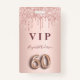 Um crachá moderno, na moda e glamouroso para uma 60ª festa de aniversário. Um fundo rosa dourado falso, pinga a pinga de tinta. O nome é escrito com um moderno e escuro, rosa dourado, escrito com letra de estilo manuscrito. Com o texto: VIP Número 60 é escrito com uma fonte de estilo de balão, script. Voltar: data da festa e endereço do local.