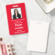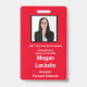 Crachá de participante de seminário em vermelho e branco. Todos os elementos podem ser alterados, incluindo: foto, nome do seminário, local e data do seminário, nome do participante, título do participante e nome da empresa.Também disponível na orientação horizontal nesta loja. Espaço no topo para cordão.