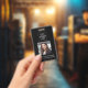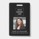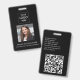 Um design moderno minimalista com logotipo personalizado, espaço reservado para foto e fonte elegante para nome personalizado e informações de contato. Fonte branca clássica com seus detalhes em um fundo preto chique. O crachá de identificação pode ser personalizado com seu nome, foto, informações de contato e links de mídia social. O código QR pode ser personalizado para direcionar ao seu site.
