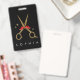 Estas tesouras brilhantes douradas fazem uma etiqueta perfeita para o seu negócio. Texto fácil de ajustar! Uma combinação clássica de cores preta e dourada. Modelo elegante de cabeleireiro com uma fita vermelha. Desta forma, seus clientes podem se lembrar do seu nome!