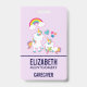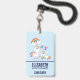 Crachá com uma mamãe unicórnio branca com crina e cauda coloridas extravagantes. Um bebê unicórnio deitado ao lado dela, com uma chupeta verde na boca. Um arco-íris colorido com nuvens fofas, e algumas estrelas e coração decoram este design doce e adorável. Um contorno rosa ousado ao redor da imagem dá a ela um visual de desenho infantil. Perfeitamente adorável para profissionais de cuidado e áreas relacionadas.