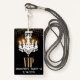 Chic Sweet 16 ou Quinceañera party acessory crachá feito a preto com gráficos de um candelabro branco que parece iluminado, e ouro com brilho no topo. O texto gráfico no brilho do ouro lê VIP. O texto branco, no fundo, está pronto para personalizar o grande dia da sua filha.