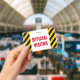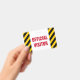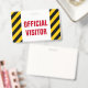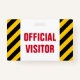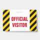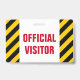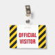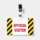Este design de insígnia apresenta um padrão de listras pretas e amarelas, juntamente com a mensagem "VISITANTE OFICIAL" em texto negrito. Poderia ser usado para identificar pessoas que são visitantes autorizados em um escritório de empresa ou algum evento.